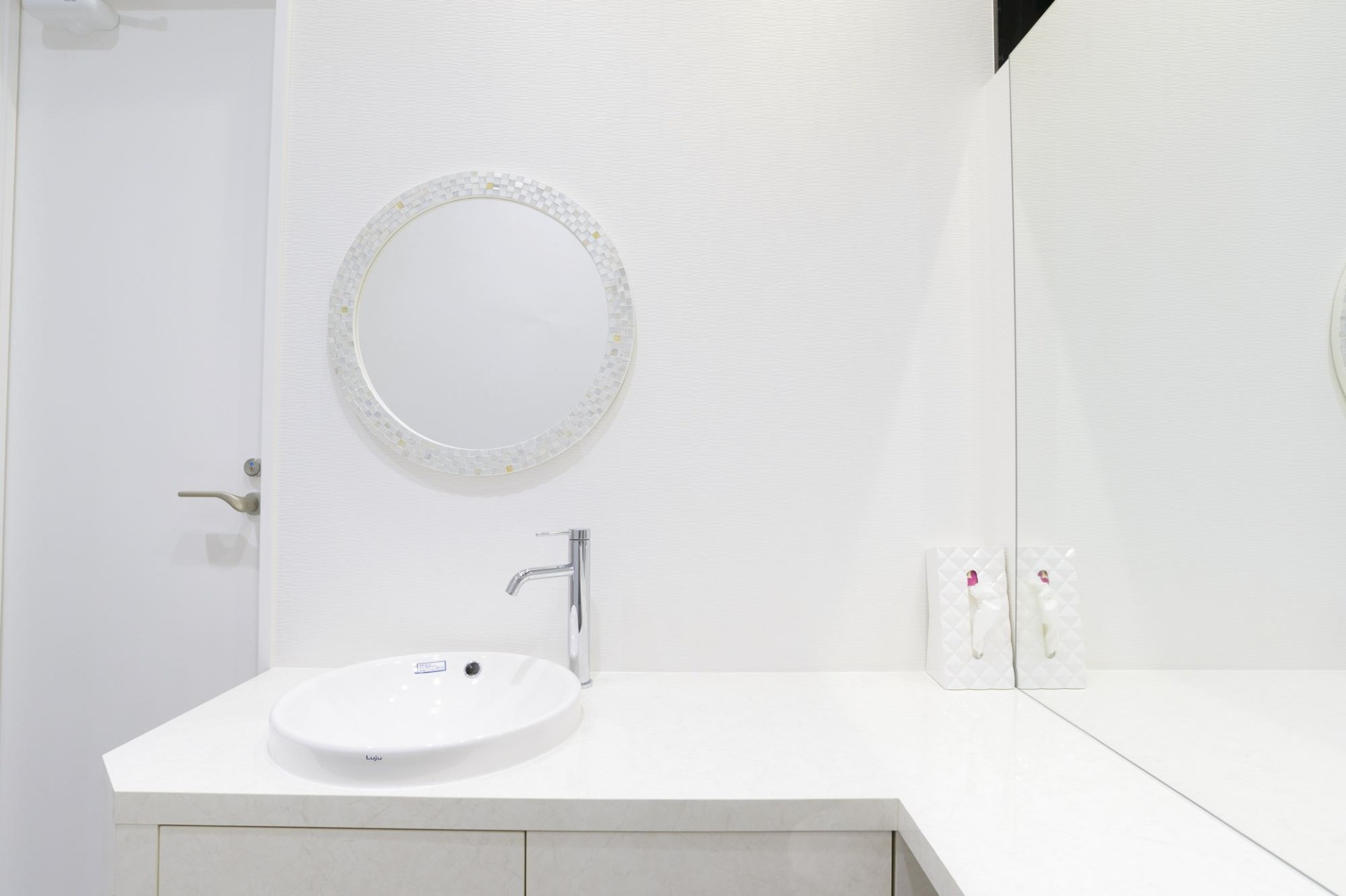 パウダールームには壁面鏡、丸鏡付洗面台、トイレがありますので、タレントのメイクルームとしてもご利用いただけます。受付裏に別のトイレがあり、タレントとスタッフが別々に使用できますので、撮影時には好評です。